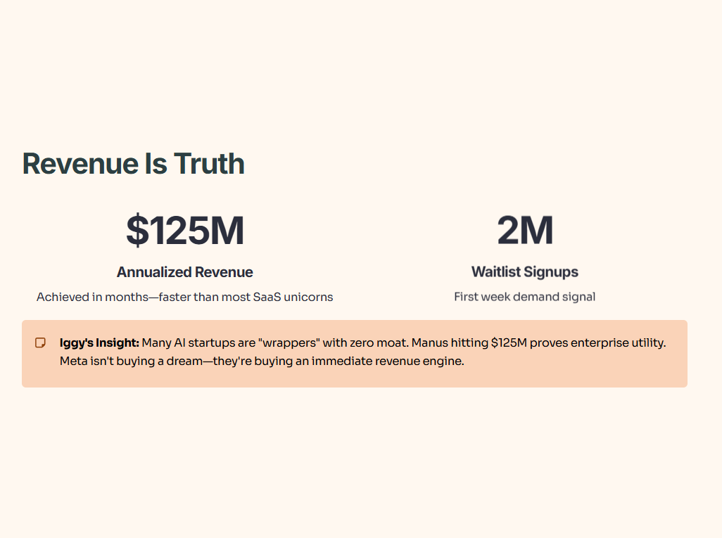 Iggy’s Insight: The market is noisy, but revenue is truth. Many AI startups are “wrappers” with zero moat. Manus hitting a $125M run rate in months proves this isn’t hype—it’s enterprise utility. Meta isn’t buying a dream; they are buying an immediate revenue engine to plug into WhatsApp and Instagram.