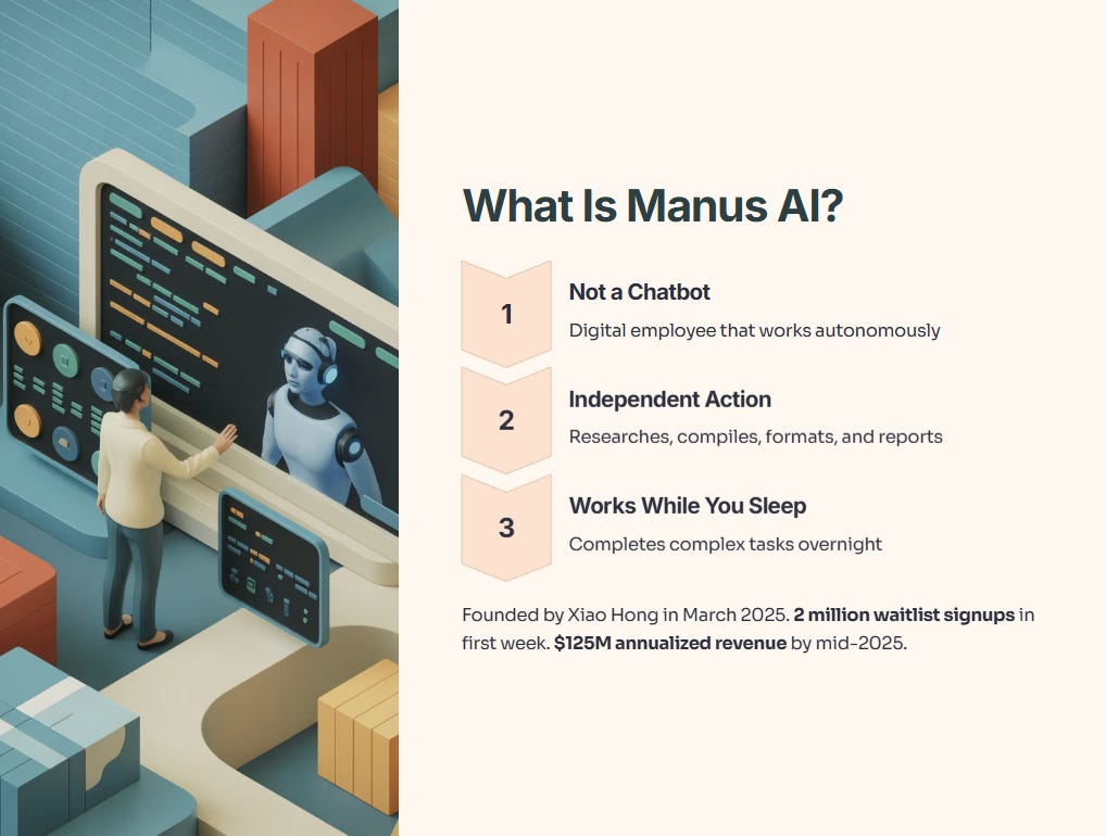 The company was founded by Xiao Hong in March 2025, came out of stealth, and immediately caught fire. Within its first week, over 2 million people joined the waitlist. By mid-2025, Manus had achieved an annualized revenue run rate of $125 million. For context, that’s faster than most SaaS unicorns.
