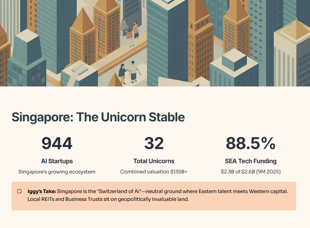 Iggy’s Take: This confirms my long-standing thesis: Singapore is the “Switzerland of AI.” We are the neutral ground where Eastern talent meets Western capital. For your portfolio, this means local real estate and infrastructure trusts (REITs/Business Trusts) are sitting on land that is becoming geopolitically invaluable.