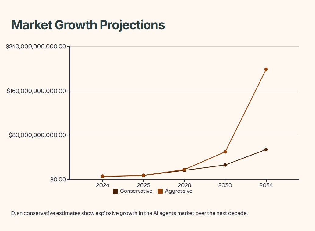 The global AI agents market was worth roughly $7.9 billion in 2024. Analysts project it will grow to between $50 billion and $199 billion by 2034. Even using conservative estimates, we are looking at a Compound Annual Growth Rate (CAGR) of over 40%.