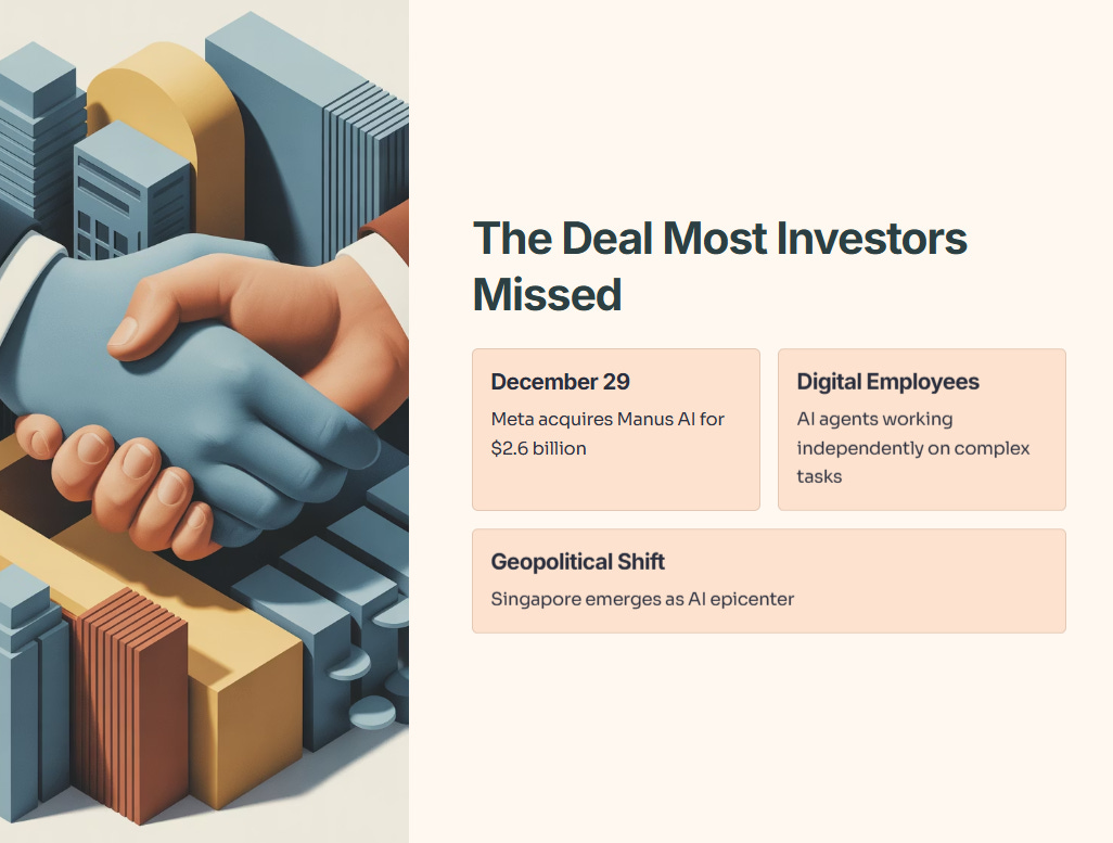 On December 29, Meta Platforms announced it was buying Manus AI, a Singapore-based artificial intelligence startup that builds “digital employees”—AI agents that work independently on complex tasks like research, coding, and data analysis. On the surface, it’s just another Big Tech acquisition. Scratch deeper, and you’ll see something more important: a validation that Singapore is now the epicenter of a geopolitical and technological shift that will reshape your investment landscape for the next decade
