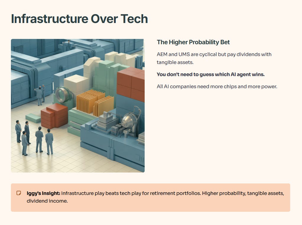 Iggy’s Insight: I prefer the infrastructure play over the tech play. AEM and UMS are cyclical, yes, but they pay dividends and have tangible assets. You don’t have to guess which AI agent will win (Manus vs. OpenAI). You just have to know that all of them need more chips and more power. That is a higher probability bet for a retirement portfolio.