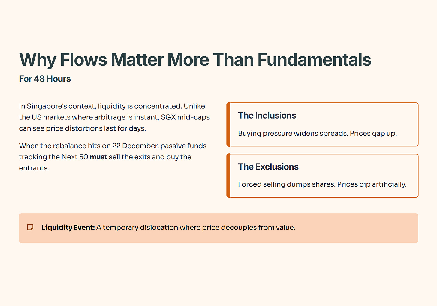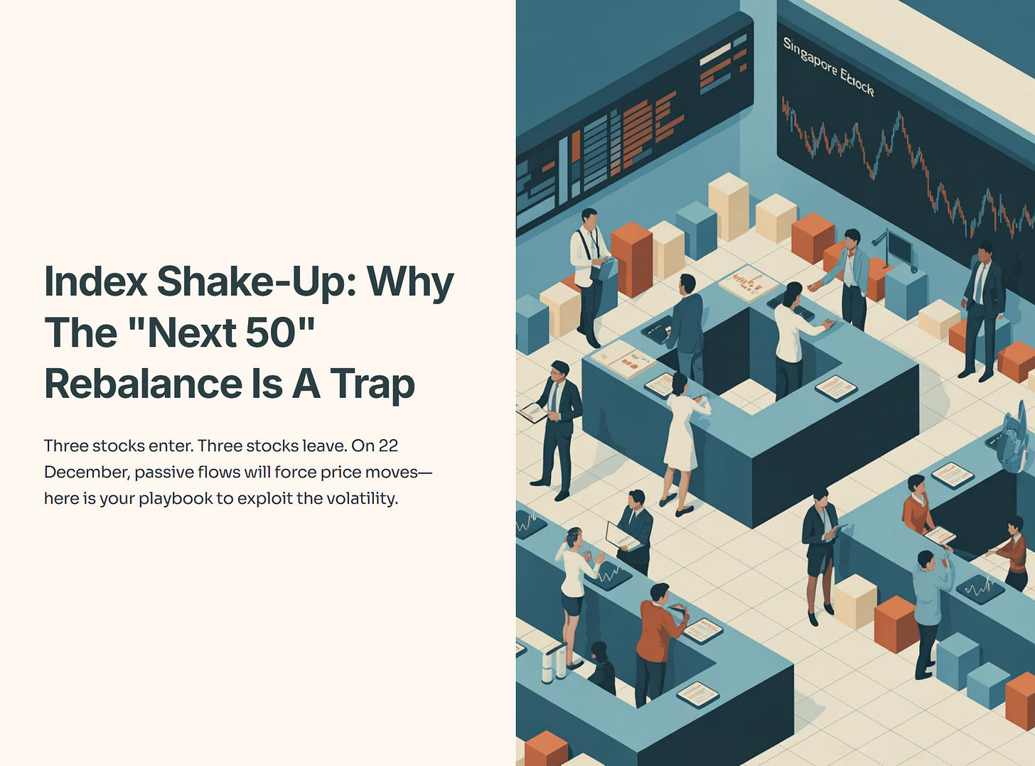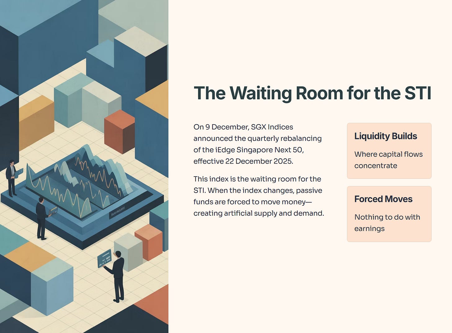 If you are a casual observer, you might ignore this. You might think, “I only care about the STI.” But if you manage your own capital, ignoring this rebalance is a mistake. This index is the waiting room for the STI. It is where liquidity builds or dies. And when the index changes, passive funds are forced to move money—creating artificial supply and demand that has nothing to do with earnings and everything to do with mechanics.