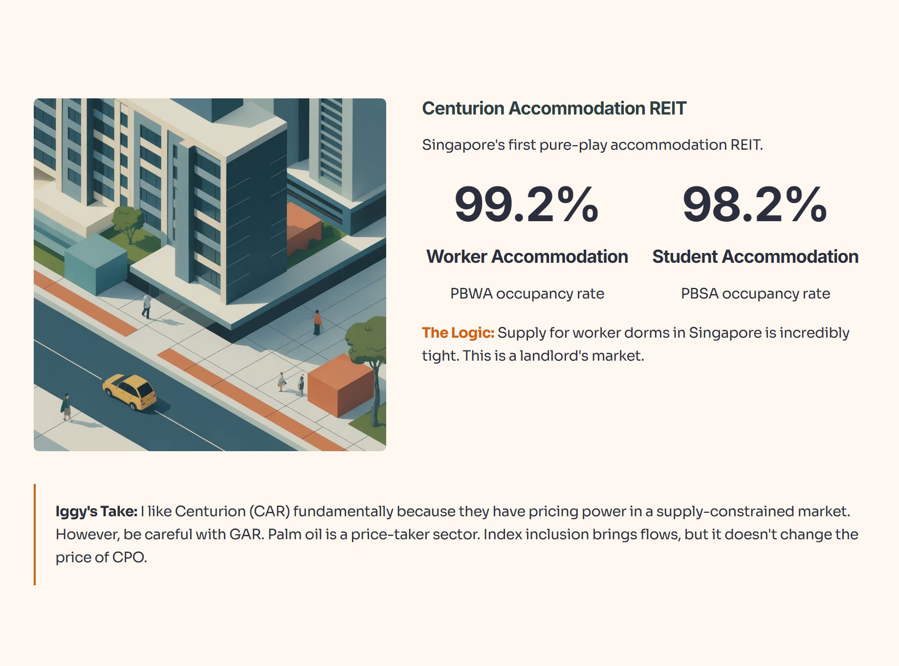 I like Centurion (CAR) fundamentally because they have pricing power in a supply-constrained market. However, be careful with GAR. Palm oil is a price-taker sector. Index inclusion brings flows, but it doesn’t change the price of Crude Palm Oil (CPO). Do not confuse a liquidity event with a change in business quality.