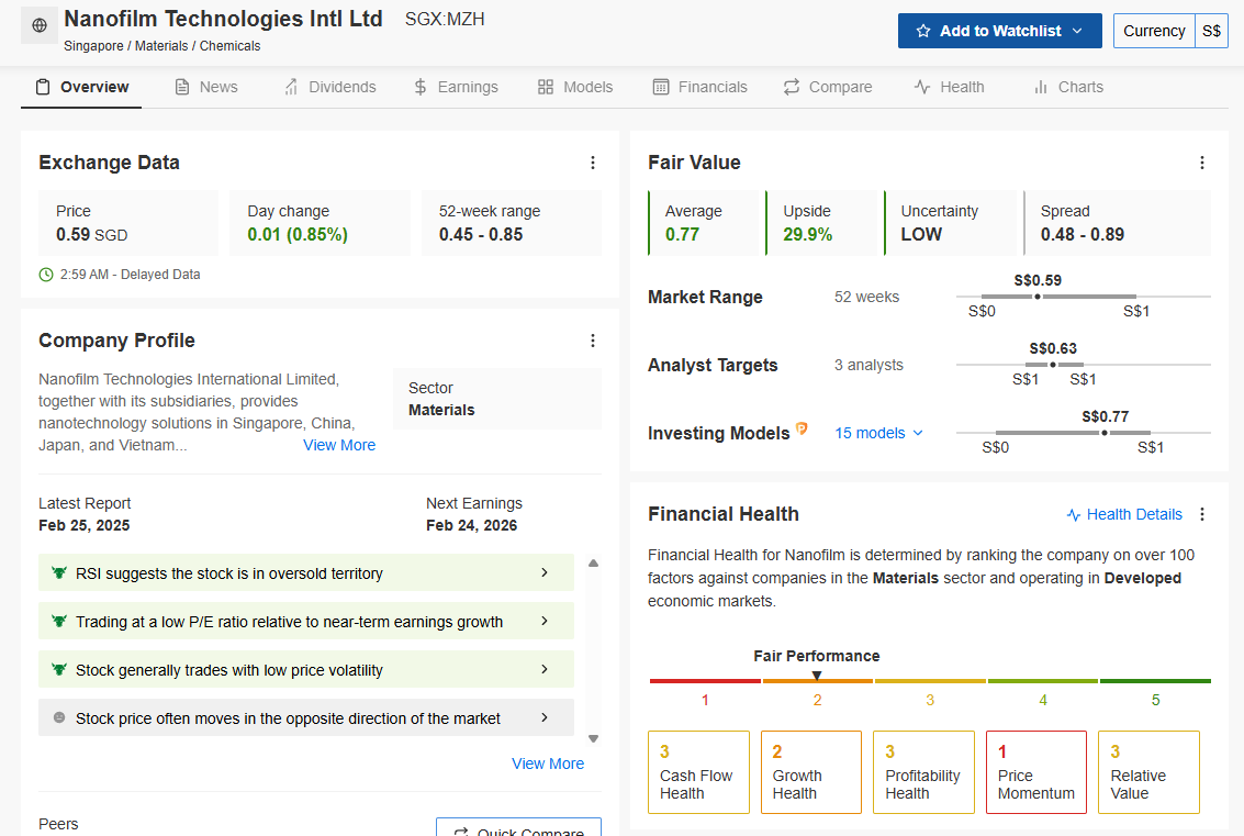 The Opportunity: The market hates this stock right now (Price Momentum is a dismal 1/5). However, the valuation is screaming “Bargain.” The models calculate a Fair Value of S$0.77, offering a massive 29.9% Upside from the current price of S$0.59.