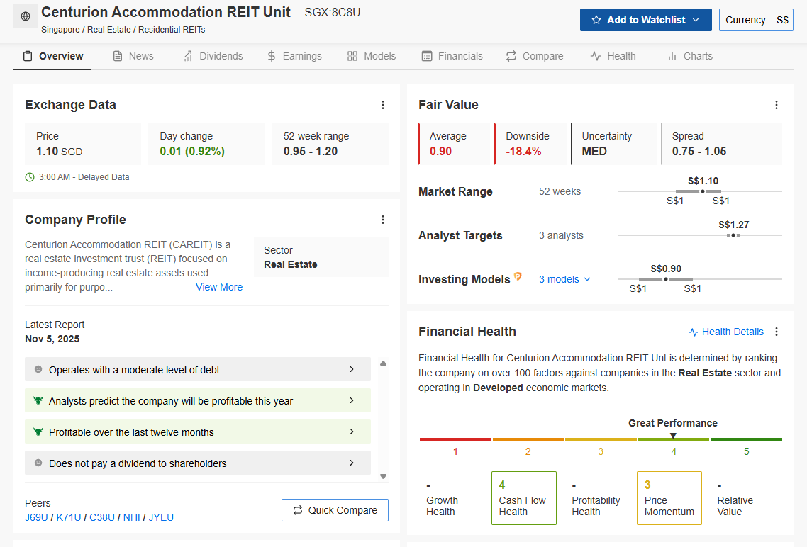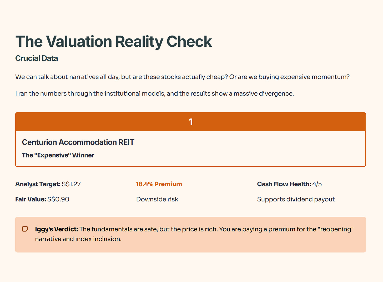 The Warning: While analysts are bullish (Target: S$1.27), the quantitative Fair Value models tell a different story. The models peg the Fair Value at **S$0.90**, suggesting the stock is currently trading at an 18.4% premium (Downside risk).