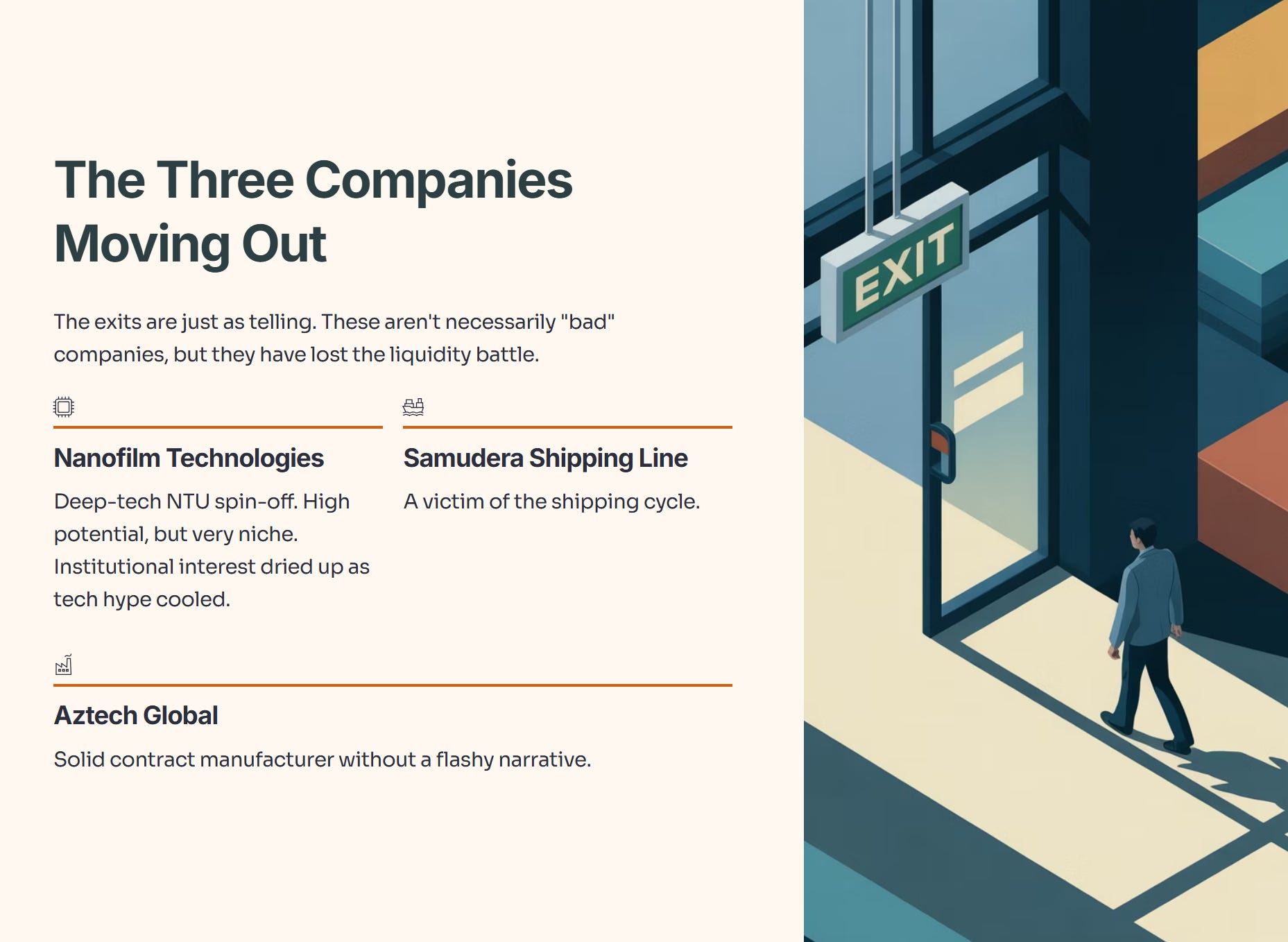 The exits are just as telling. These aren’t necessarily “bad” companies, but they have lost the liquidity battle.