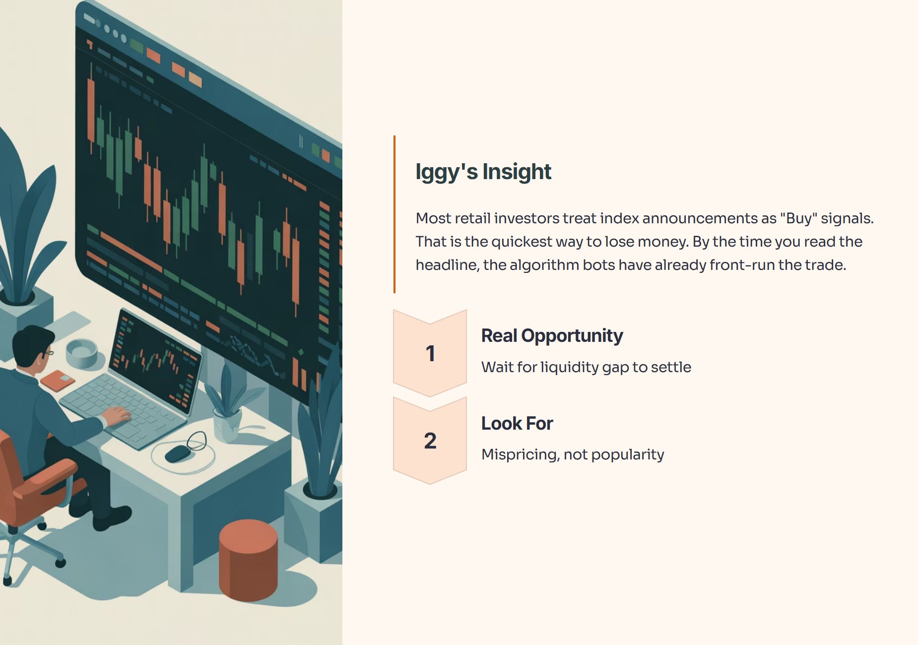 Most retail investors treat index announcements as “Buy” signals. That is the quickest way to lose money. By the time you read the headline, the algorithm bots have already front-run the trade. The real opportunity isn’t chasing the entrance; it’s waiting for the liquidity gap to settle. We are looking for mispricing, not popularity.