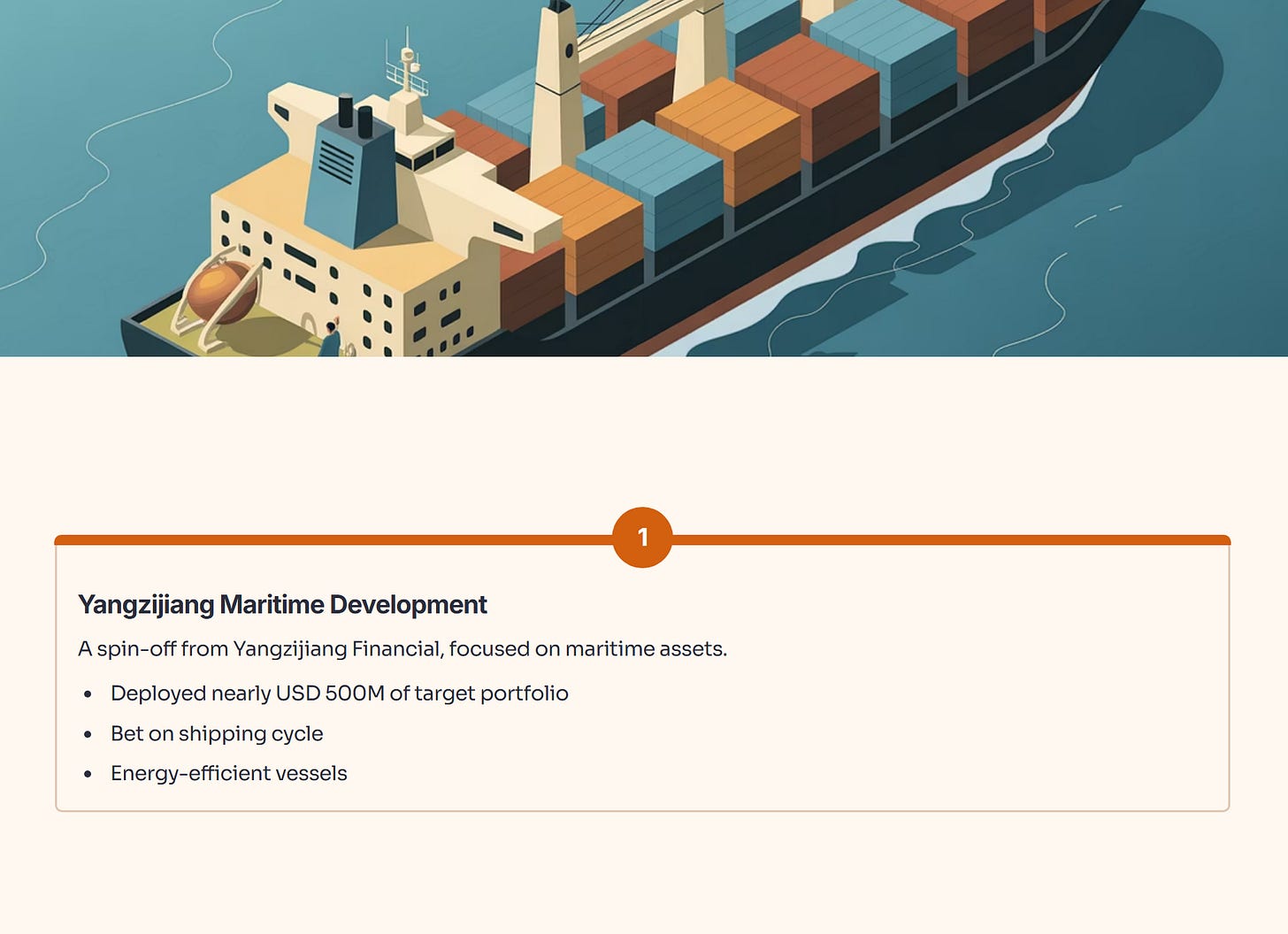 A spin-off from Yangzijiang Financial, focused on maritime assets. They have deployed nearly USD 500M of their target portfolio.