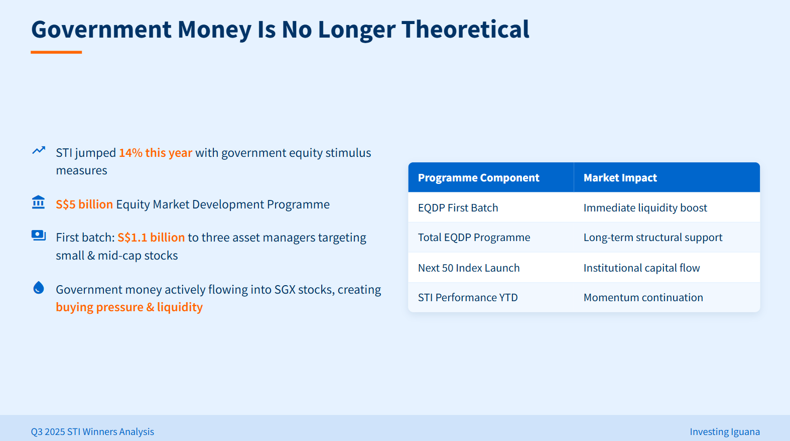 Iggy: If you own small or mid-cap SGX stocks, pay close attention—fresh government money could drive surprise rallies and liquidity spikes in your holdings.