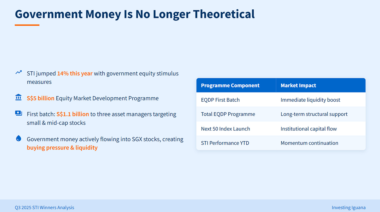 The S$5 billion Equity Market Development Programme just allocated its first S$1.1 billion to three asset managers in July, specifically targeting small and mid-cap stocks. What does this mean for your holdings? It means government money is actively flowing into SGX stocks, creating real buying pressure and liquidity that wasn’t there before. Think about how this creates a supportive environment for the entire market, not just the big caps.