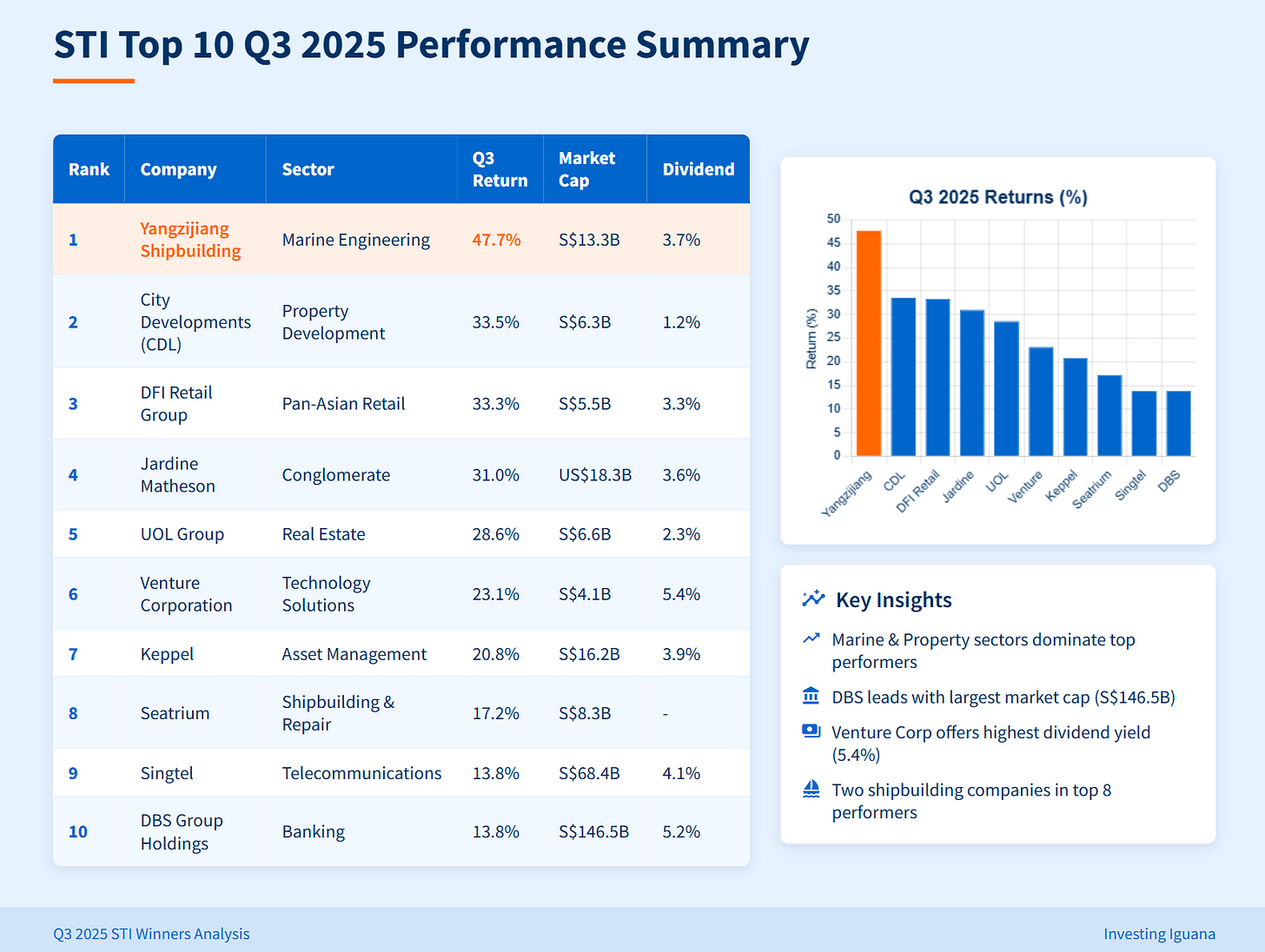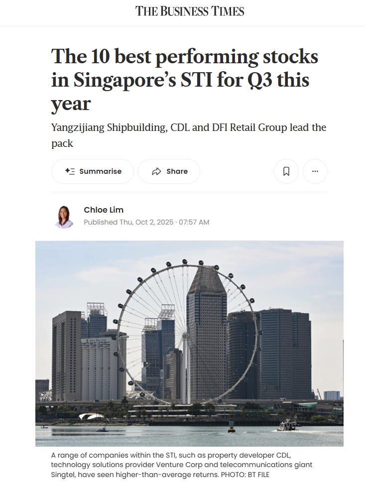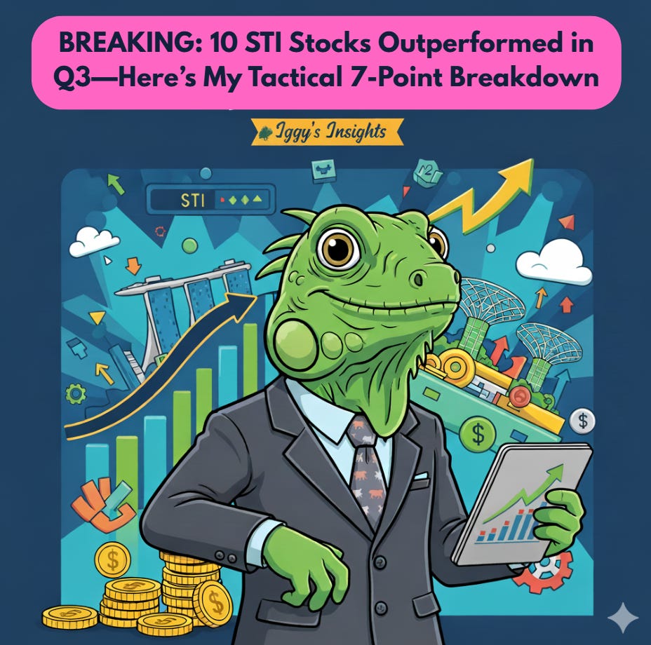 Hey friends, welcome back. I’m Iggy, and usually we’re diving deep into long-term strategies, but today we’re hitting pause for something urgent. Business Times just revealed the 10 best-performing STI stocks for Q3 2025, and some of these numbers are absolutely stunning. This isn’t just another headline - it’s the kind of news that can send ripples directly through your SGX portfolio, fast.