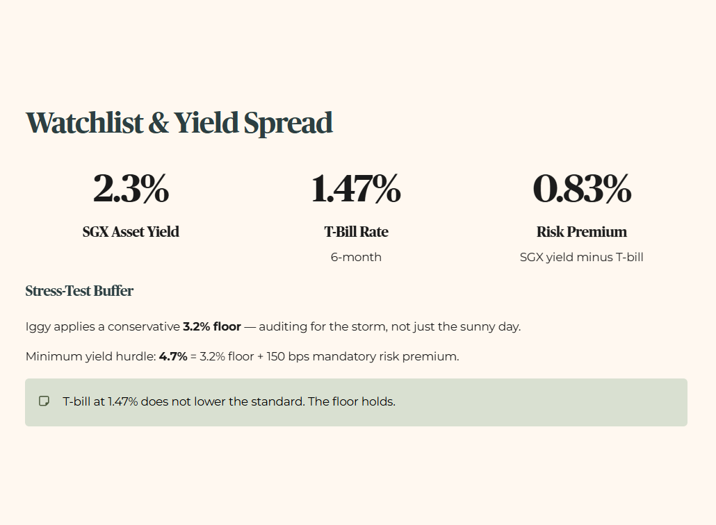 Note on the Stress-Test Buffer. For this audit, I apply a conservative floor of 3.2%. I audit for the storm, not just the sunny day. While the T-bill sits at 1.47%, I do not lower my standards to match a temporary market dip. My floor remains at 3.2% to ensure sanctuary assets can withstand a return to long-term average interest rates. The minimum yield hurdle is 4.7%, which is the 3.2% floor plus 150 basis points of mandatory risk premium.