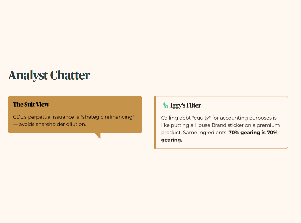 🦎Iggy’s Take: “CDL’s S$2 billion perpetual programme is being sold as financial engineering. I call it debt with a better suit on. When your gearing sits at 70% and your forward yield barely clears 2.8%, you are paying premium price for a balance sheet that is still doing heavy lifting on borrowed time. The Debt Wall does not care what you call the instrument. My monitoring threshold has not been crossed for accumulation — it has been crossed as a caution flag.”