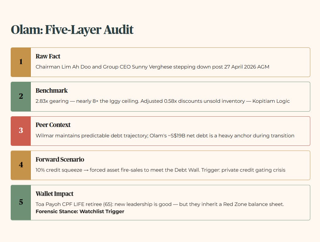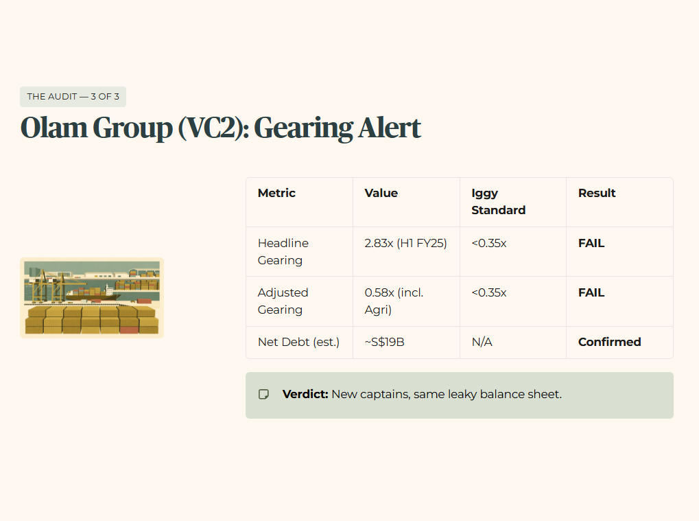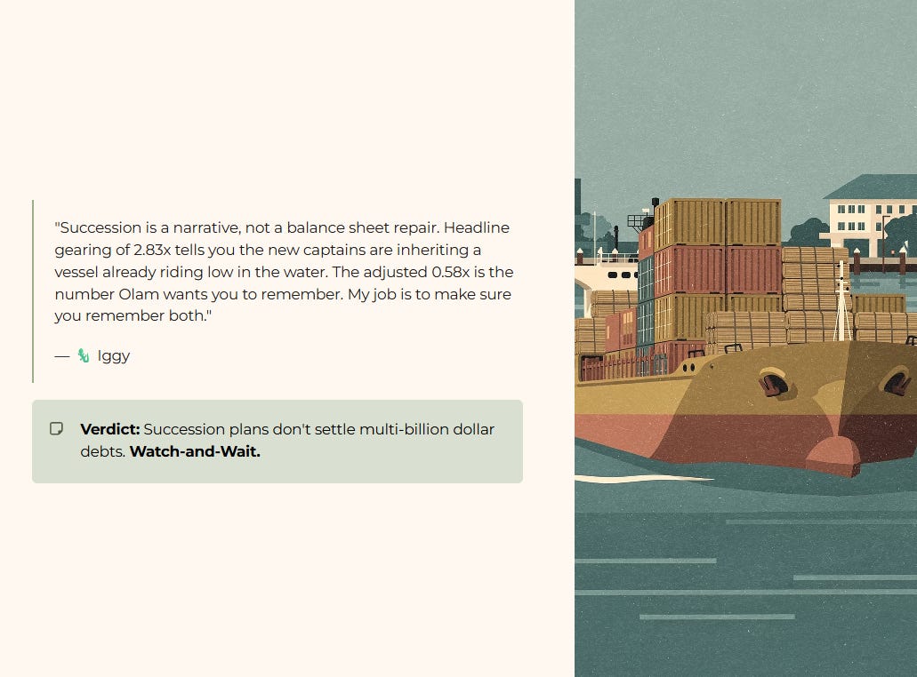 🦎Iggy’s Take: “Leadership changes at Olam are overdue and arguably positive. But succession is a narrative, not a balance sheet repair. Headline gearing of 2.83x tells you the new captains are inheriting a vessel that is already riding low in the water. The adjusted 0.58x figure is the number Olam wants you to remember. My job is to make sure you remember both. Until the Debt Wall refinancing risk is visibly de-risked under new management, this stays firmly in Watch-and-Wait territory.”