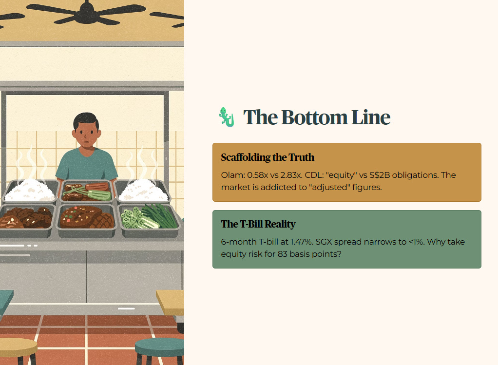 Scaffolding the Truth. Today’s data shows a market addicted to “adjusted” figures. Olam wants us to look at 0.58x gearing instead of 2.83x. CDL wants us to see “equity” instead of S$2 billion in fresh obligations.