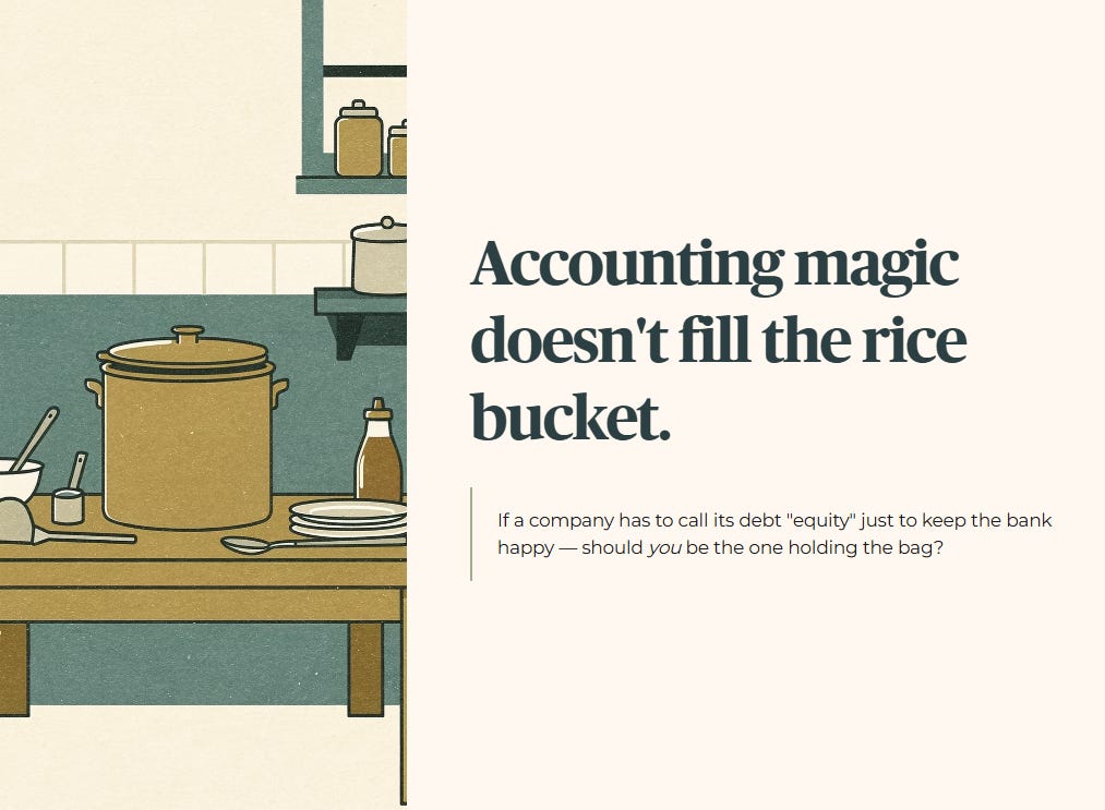 Rhetorical Question. If a company has to call its debt “equity” just to keep the bank happy, should you be the one holding the bag?