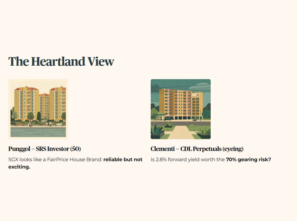 The Heartland View. If you are a 50-year-old in Punggol managing SRS, SGX looks like a FairPrice House Brand: reliable but not exciting. For the Clementi investor eyeing CDL’s perpetuals, ask yourself this — is the 2.8% forward yield worth the 70% gearing risk?