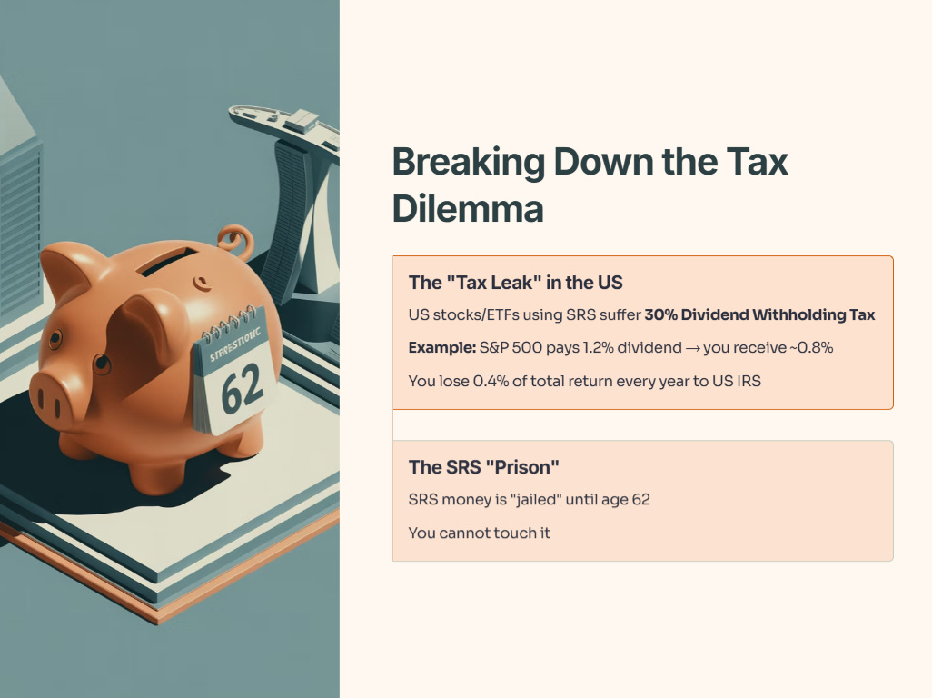 1. The “Tax Leak” in the US: If you buy US stocks/ETFs using SRS, you suffer a 30% Dividend Withholding Tax.