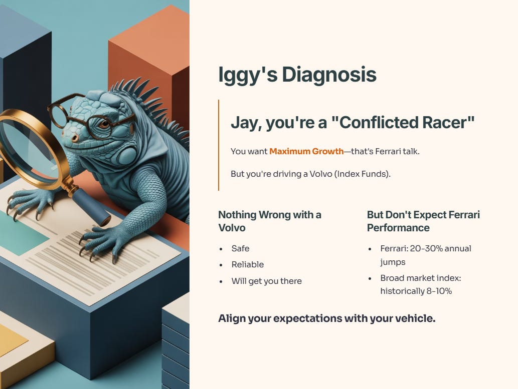 You told me you want Maximum Growth—that’s Ferrari talk. But you are driving a Volvo (Index Funds).