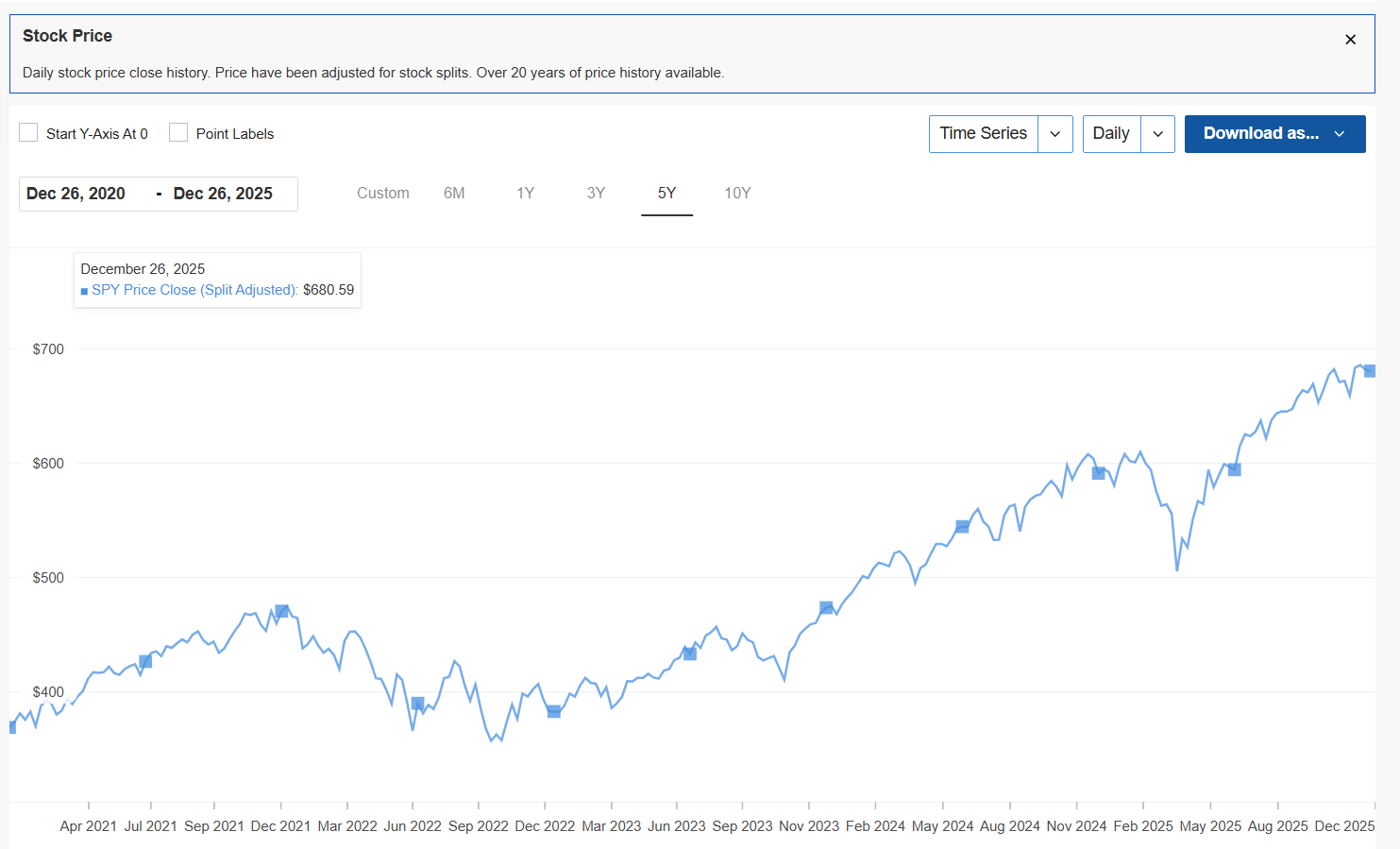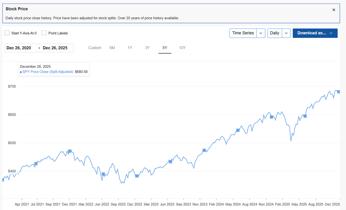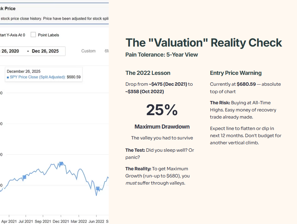 • The 2022 Lesson: See that drop from ~$475 (Dec 2021) down to ~$358 (Oct 2022)? That is a ~25% drop.