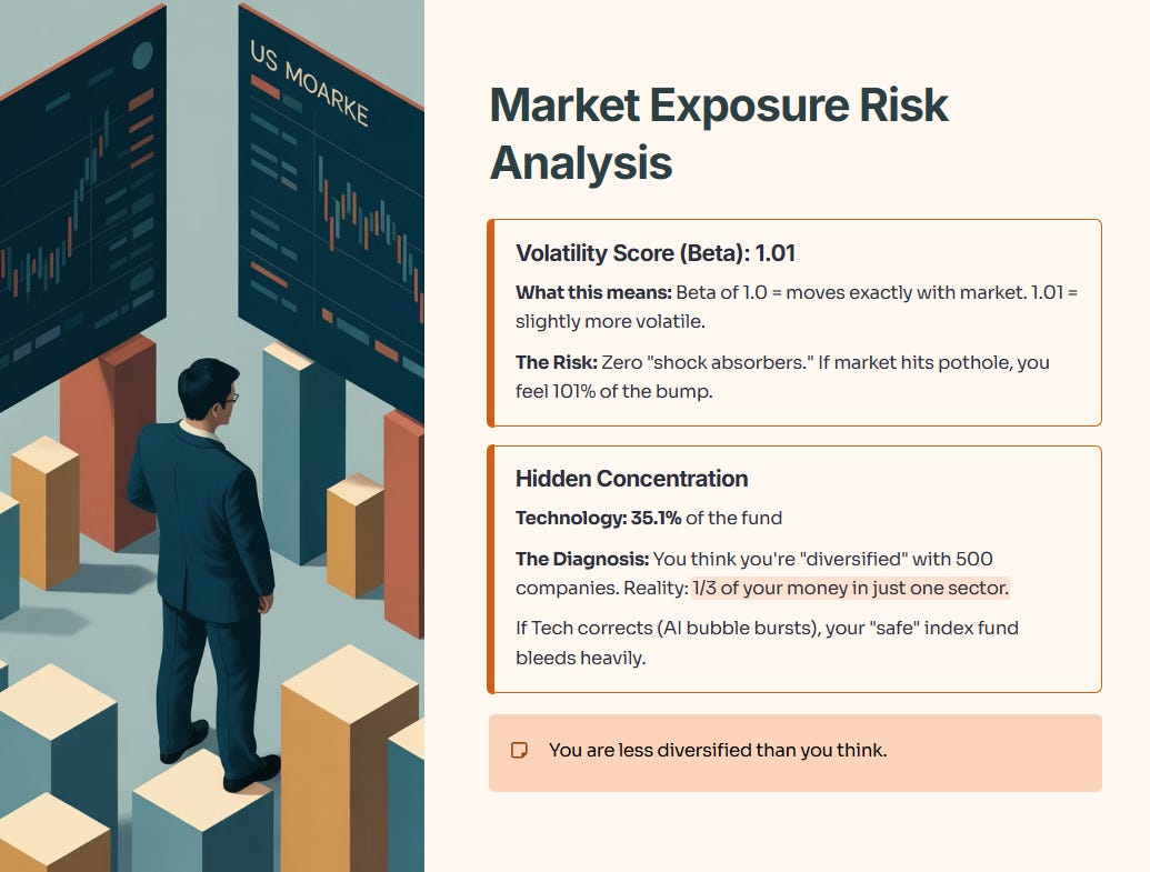 • The Diagnosis: You think you are “diversified” because you own 500 companies. In reality, 1/3 of your money is in just one sector. If the Tech sector corrects (e.g., AI bubble bursts), your “safe” index fund will bleed heavily. You are less diversified than you think.