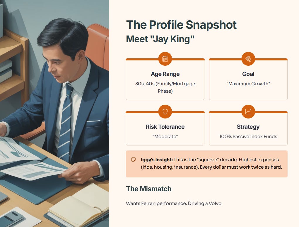• Risk Tolerance: “Moderate” (He gets nervous if the ride gets too bumpy).