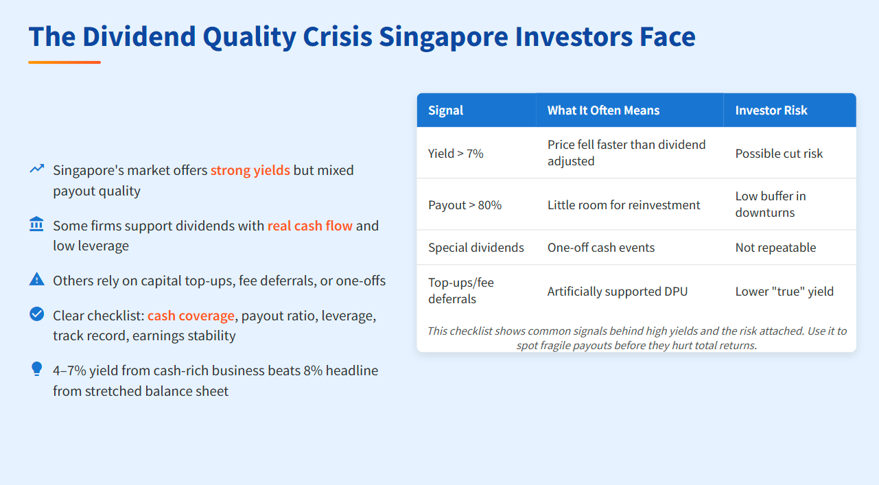 Singapore’s market still offers strong yields. Yet, payout quality is mixed. Some firms support dividends with real cash flow and low leverage. Others rely on capital top-ups, fee deferrals, or one-offs. This can fool screeners and tempt investors. The fix is a clear checklist: cash coverage, payout ratio, leverage, track record, and earnings stability.