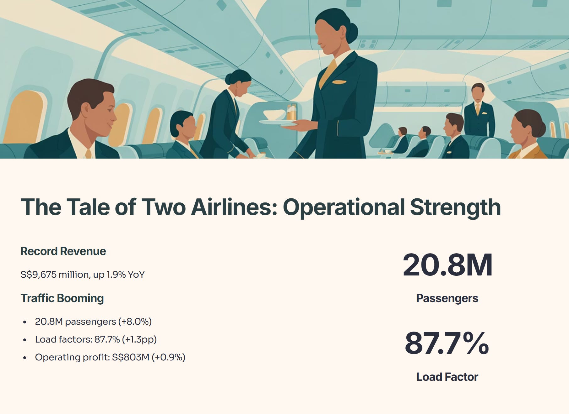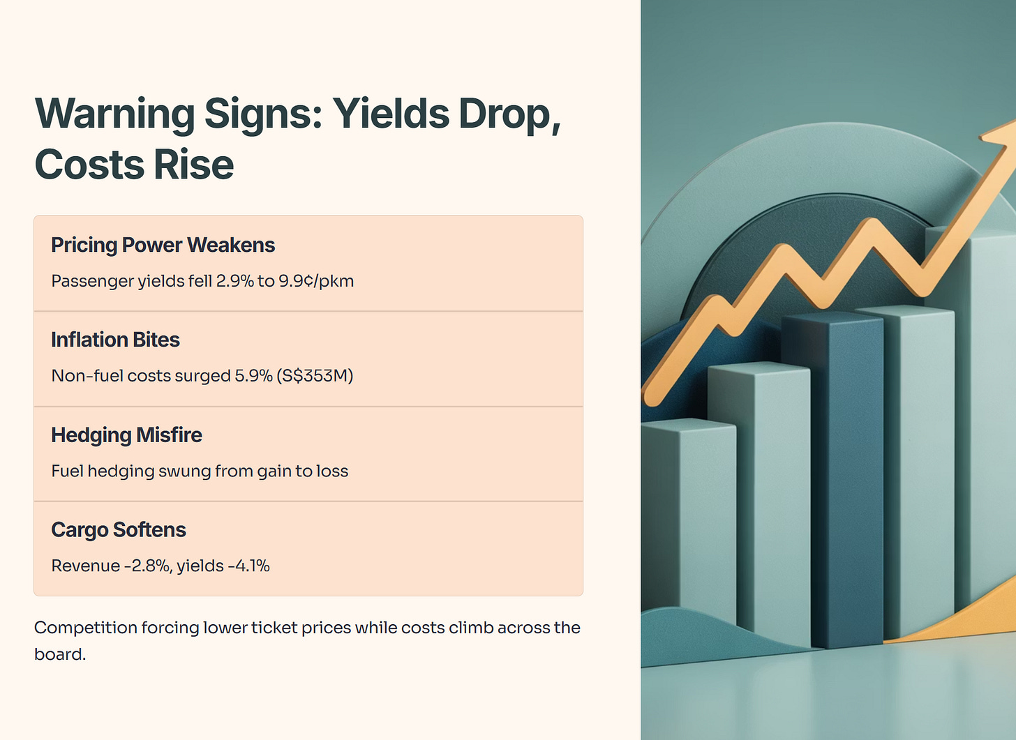 Pricing Power is Weakening: Passenger yields fell 2.9% to 9.9 cents/pkm [Page 2]. This means SIA is making less money for every kilometer flown because competition is forcing them to lower ticket prices.