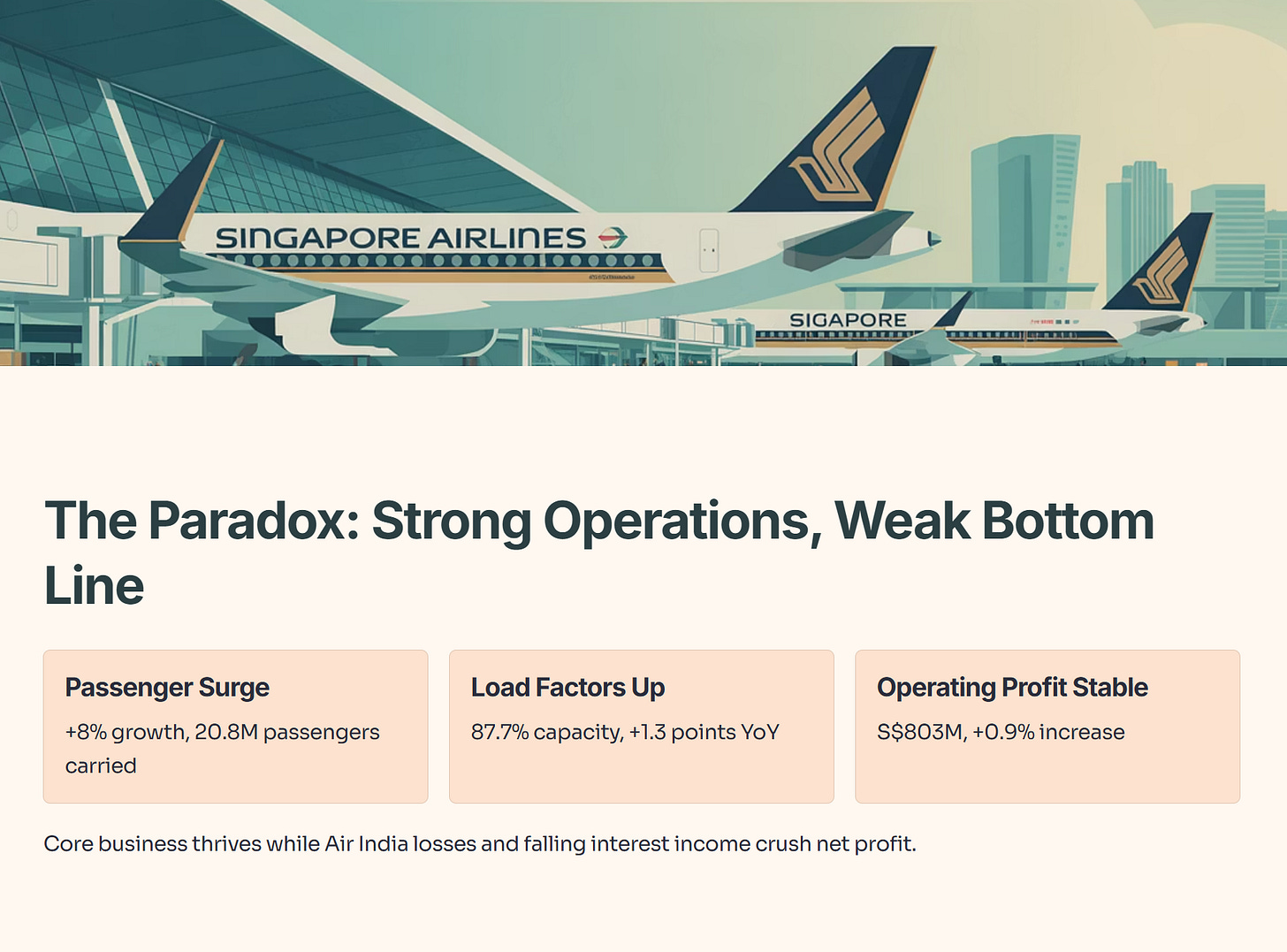 While operating profit held steady at S$803 million, a massive S$417 million swing in losses from associated companies (primarily Air India) and falling interest income crushed the bottom line. Yet, beneath that ugly net profit number, the core business shows resilience: passenger numbers surged 8%, load factors climbed, and the company even announced a S$0.9 billion special dividend plan.