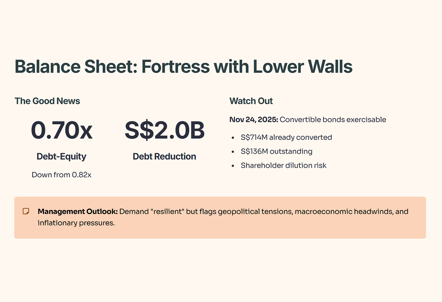 Convertible Bonds: Watch out for November 24, 2025. Convertible bonds are exercisable until this date. S$714 million have already been converted, diluting shareholders, with S$136 million outstanding [Page 3].