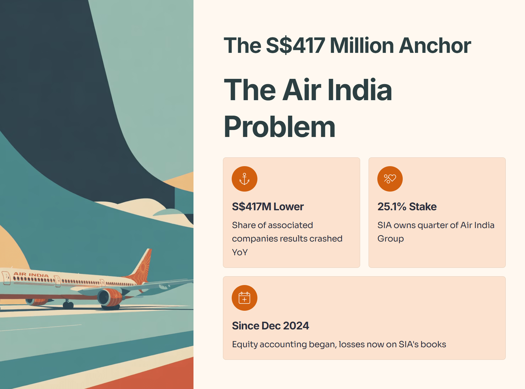 Why? Because SIA owns a 25.1% stake in the Air India Group [Page 4]. This was a strategic move to tap into the massive Indian aviation market, but right now, it is bleeding cash.