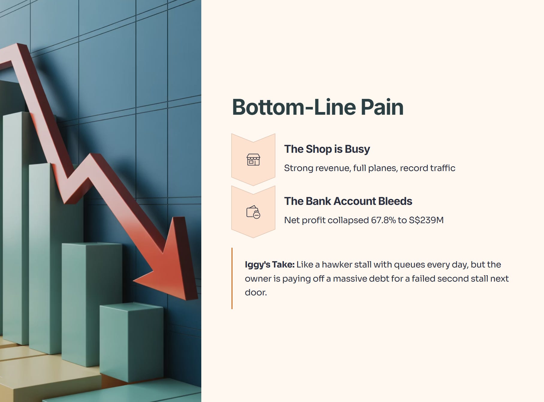 But here is the problem: While the “shop” is busy, the bank account is taking a hit. Net profit collapsed 67.8% to S$239 million [Page 1].