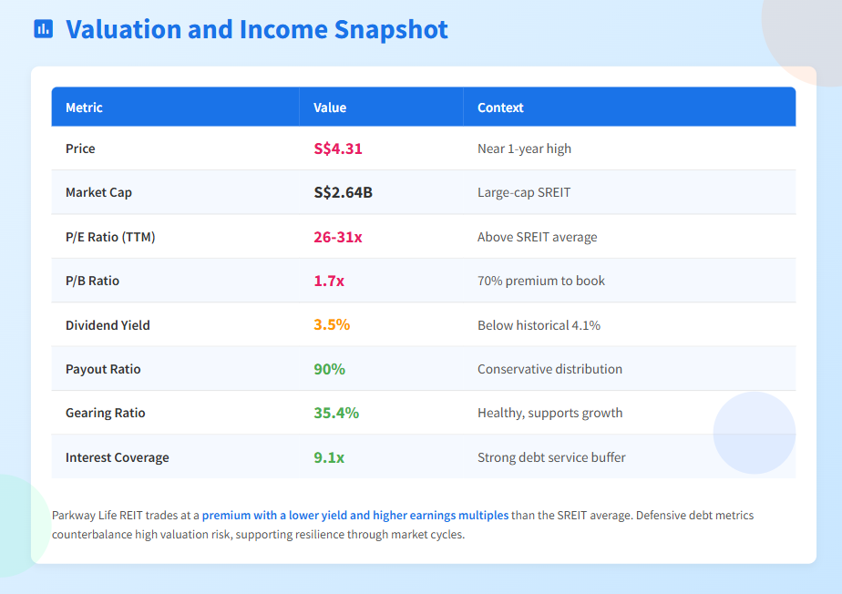 Parkway Life REIT trades at a premium with a lower yield and higher earnings multiples than the SREIT average. Defensive debt metrics counterbalance high valuation risk, supporting resilience through market cycles.