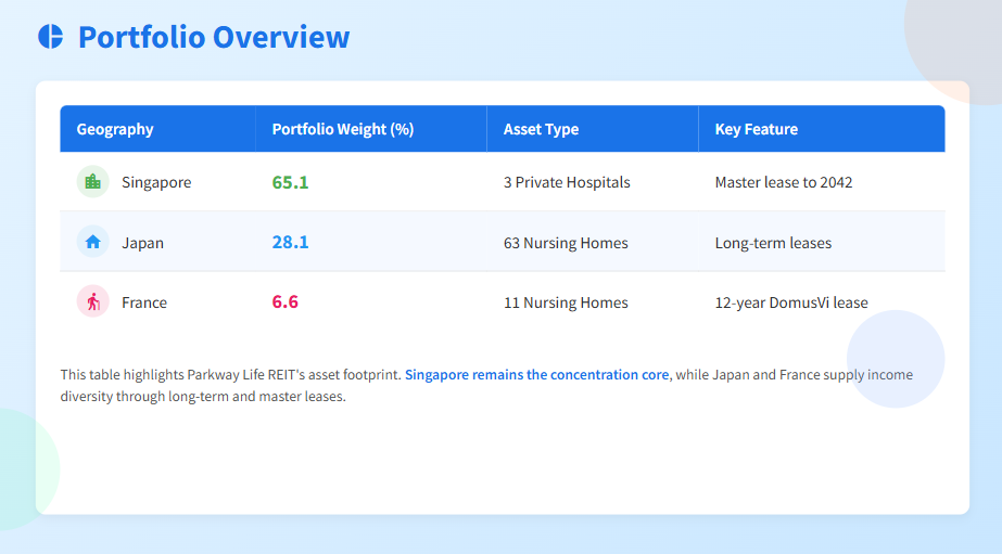 This table highlights Parkway Life REIT’s asset footprint. Singapore remains the concentration core, while Japan and France supply income diversity through long-term and master leases.
