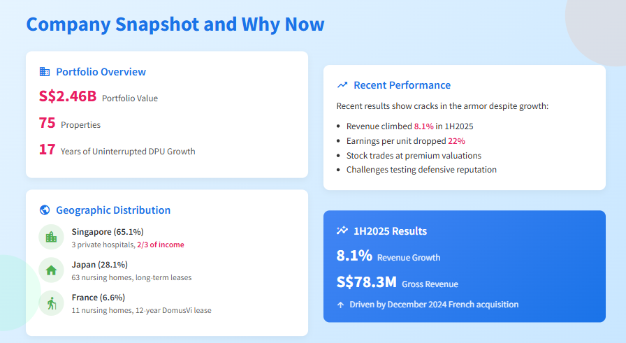 Healthcare REITs typically offer stability when markets turn volatile. But recent results show cracks in the armor. While revenue climbed 8.1% in 1H2025, earnings per unit dropped 22% and the stock trades at premium valuations. Singapore investors need clarity on whether this healthcare stalwart remains a reliable income play or if warning signs are flashing red.
