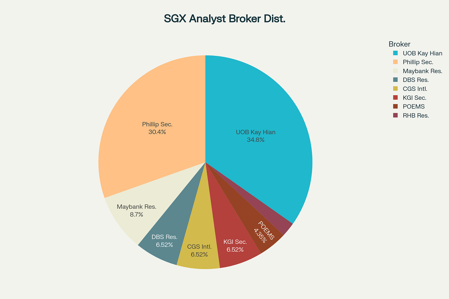 UOB Kay Hian emerges as the most active research house, contributing 16 recommendations (34.8%), followed closely by Phillip Securities with 14 recommendations (30.4%). This concentration reflects these firms' deep focus on Singapore equities and their comprehensive coverage of local stocks.