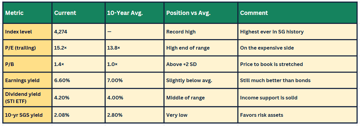 STI valuations look rich using both P/E and price-to-book. On earnings yield (what you get for each dollar invested), stocks still pay out much more than bonds. Dividend yields are holding up, so income investors remain supported. It’s not a screaming bargain, but it’s not bubble territory by the numbers.