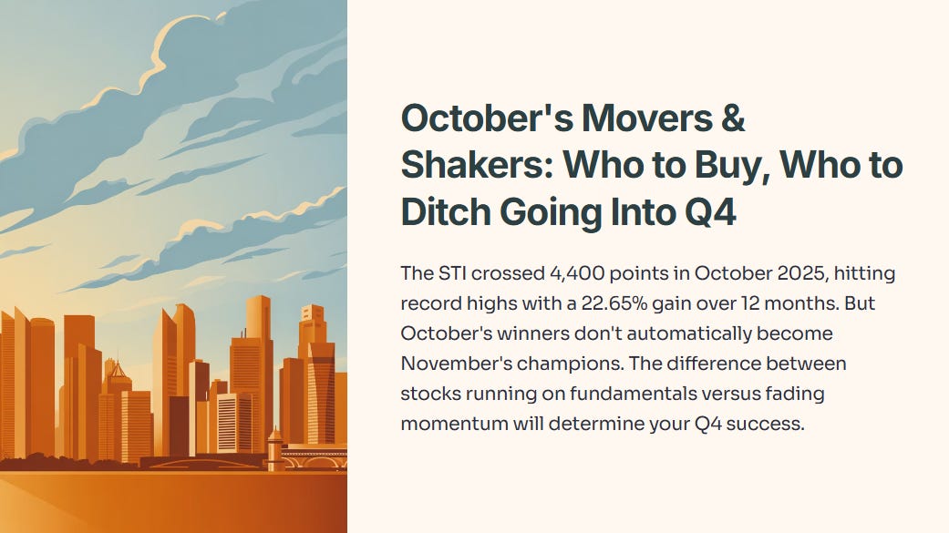 You watched Singapore stocks hit record highs in October 2025. The STI crossed 4,400 points. Your portfolio looked pretty good. But here’s what most investors miss: October’s winners don’t automatically become November’s champions. Some are just getting started. Others are running on fumes. The difference between the two will determine whether you end Q4 celebrating or cursing your decisions. Let me show you exactly who deserves your money going into the final quarter and who you should avoid like the plague.