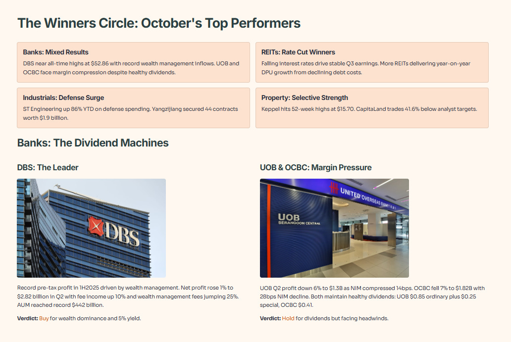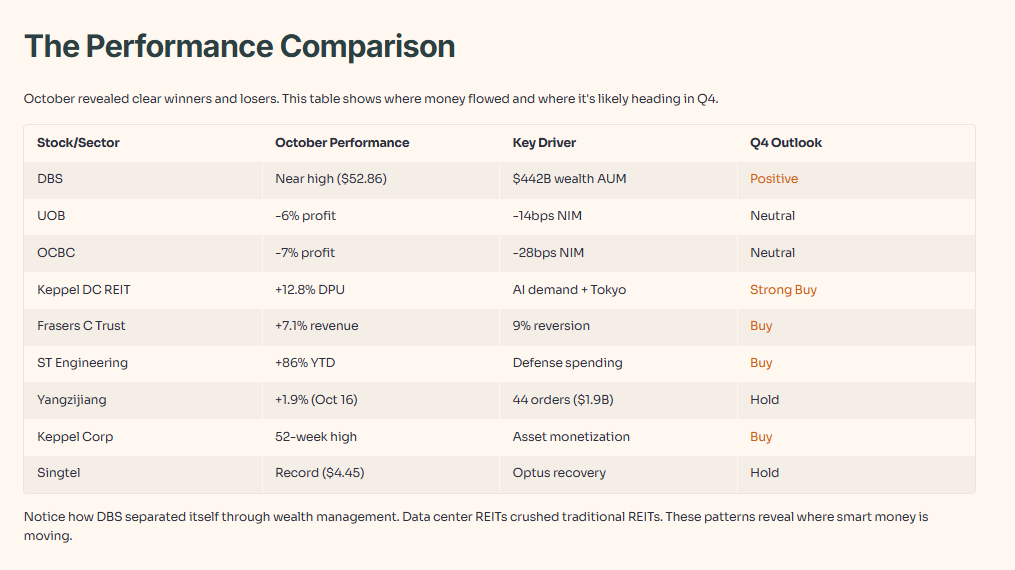 This table shows you exactly where the money flowed in October and where it’s likely to flow in Q4. Notice how DBS separated itself from UOB and OCBC through wealth management. Notice how data center REITs crushed traditional REITs. These patterns tell you what the smart money is doing.