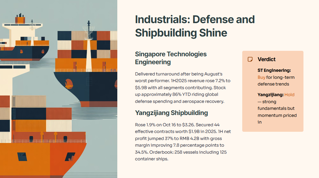 October delivered distinct winners across multiple sectors. Banks showed mixed performance despite record earnings. REITs benefited from falling interest rates. Industrial stocks rode defense spending and shipbuilding momentum. Property counters saw selective strength.