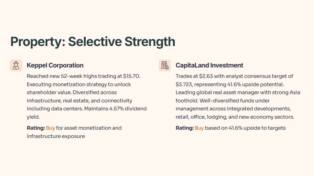 Buy, Hold, or Sell? Keppel is a Buy for its asset monetization strategy and infrastructure exposure. CapitaLand Investment is a Buy based on the 41.6% upside to analyst targets and diversified real estate exposure.