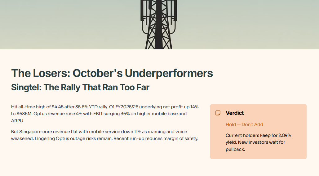 Singtel hit an all-time high of $4.45 in October after a strong 35.6% year-to-date rally. The telco delivered strong Q1 FY2025/26 results with underlying net profit up 14% to $686 million. Optus revenue rose 4% year-on-year with EBIT surging 36% on higher mobile customer base and improved average revenue per user.
