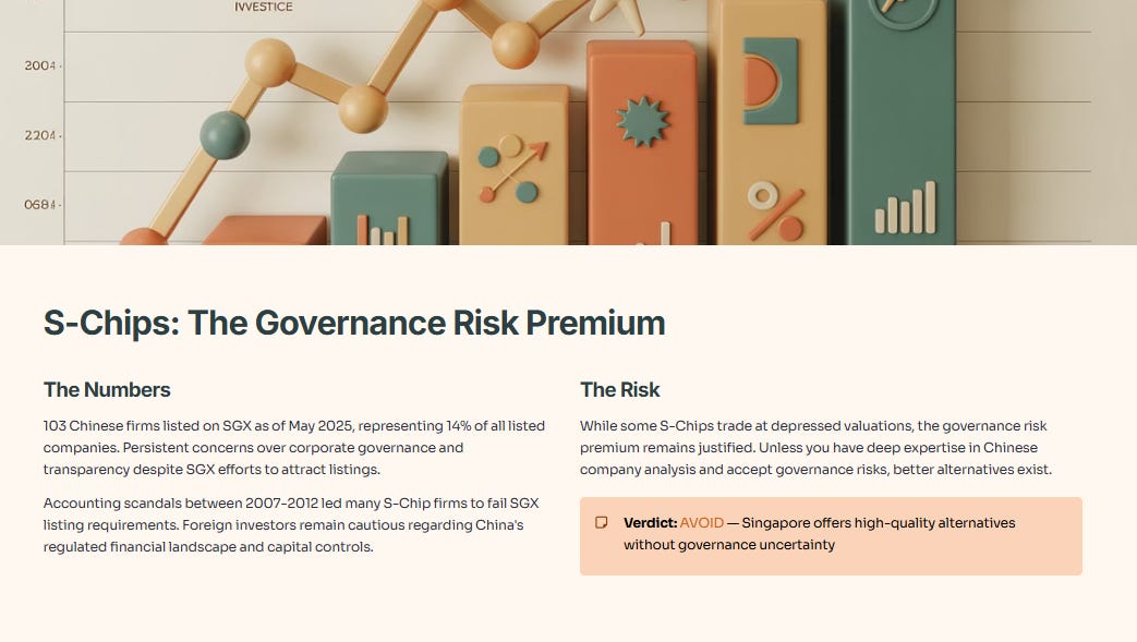 Avoid Unless you have deep expertise in Chinese company analysis and accept the governance risks, avoid S-Chips. Singapore offers plenty of high-quality alternatives without the governance uncertainty.