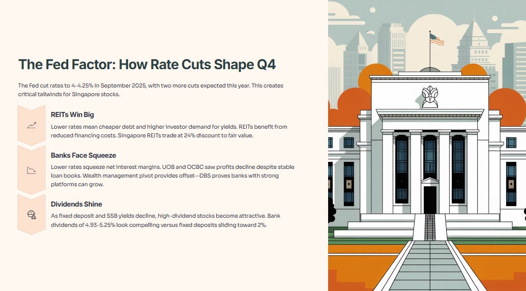 The US Federal Reserve’s rate cutting cycle provides critical tailwinds for Singapore stocks. The Fed cut rates to a range of 4% to 4.25% in September 2025, with two more cuts expected this year. This creates several important effects for Singapore investors.