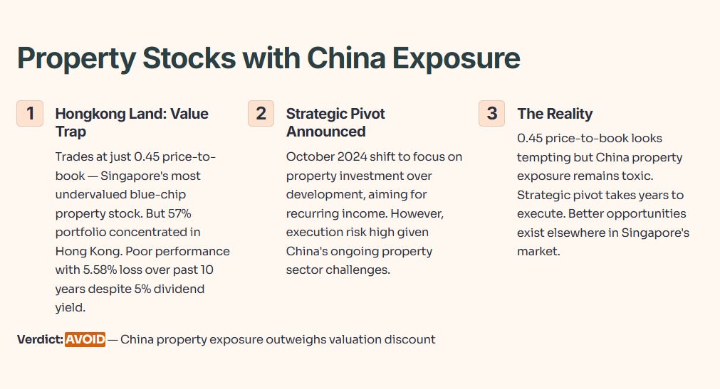 Avoid The 0.45 price-to-book ratio looks tempting, but China property exposure remains toxic. The strategic pivot will take years to execute. Better opportunities exist elsewhere in Singapore’s market.