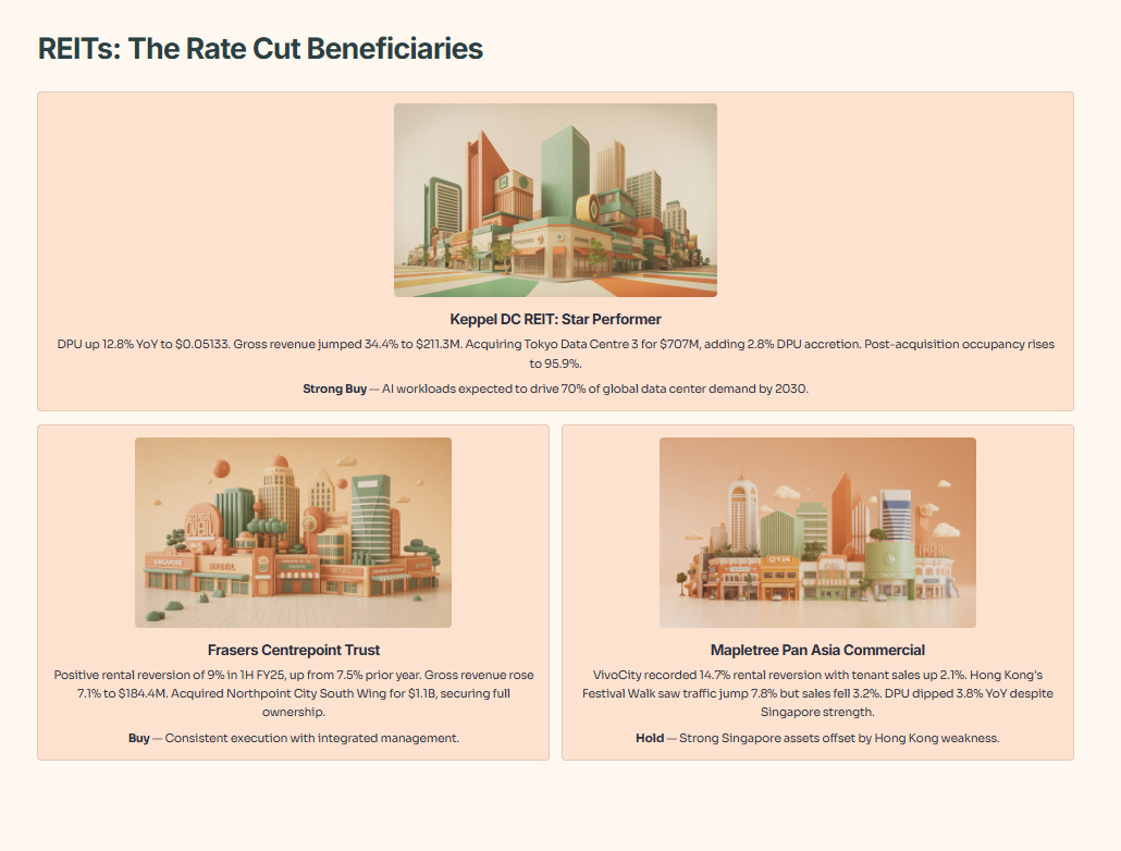 Singapore REITs emerged as clear winners from falling interest rates. The sector is expected to deliver stable Q3 earnings driven by easing debt costs and resilient operating metrics. More REITs are now delivering year-on-year distribution per unit growth helped by declining average interest expenses.