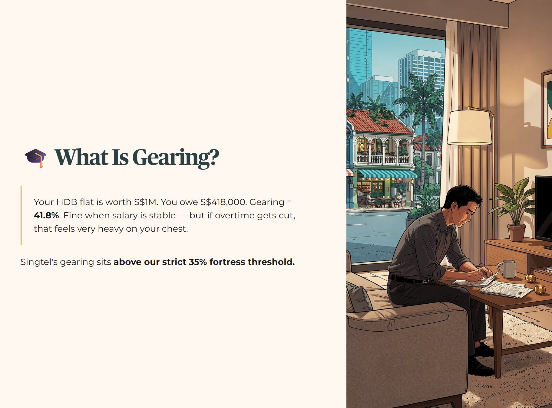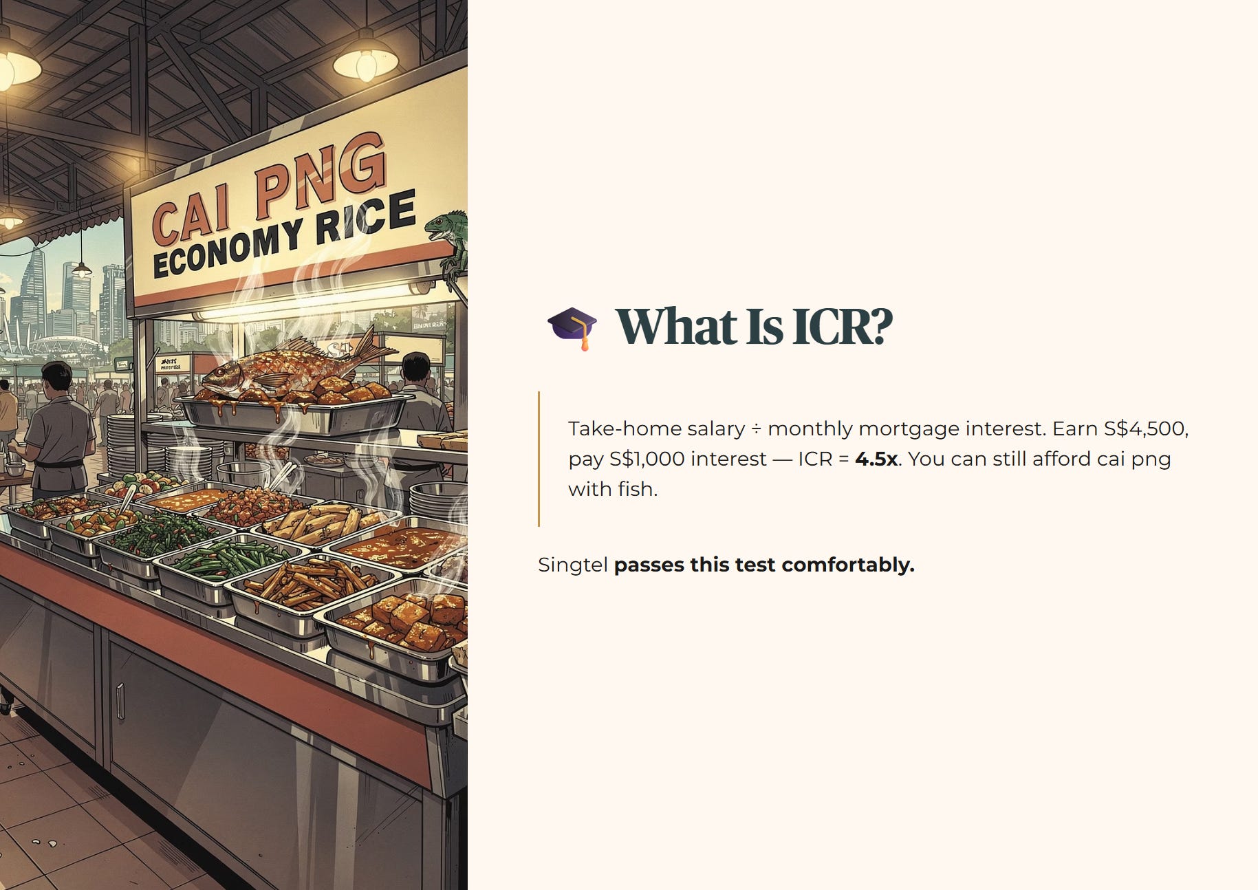 🎓 Educational Note: ICR Think of ICR as your monthly take-home salary divided by your monthly mortgage interest. If you earn S$4,500 and your interest payment is S$1,000, your ICR is 4.5x. You can comfortably pay the bank and still afford to eat cai png with fish. Singtel passes this test comfortably.
