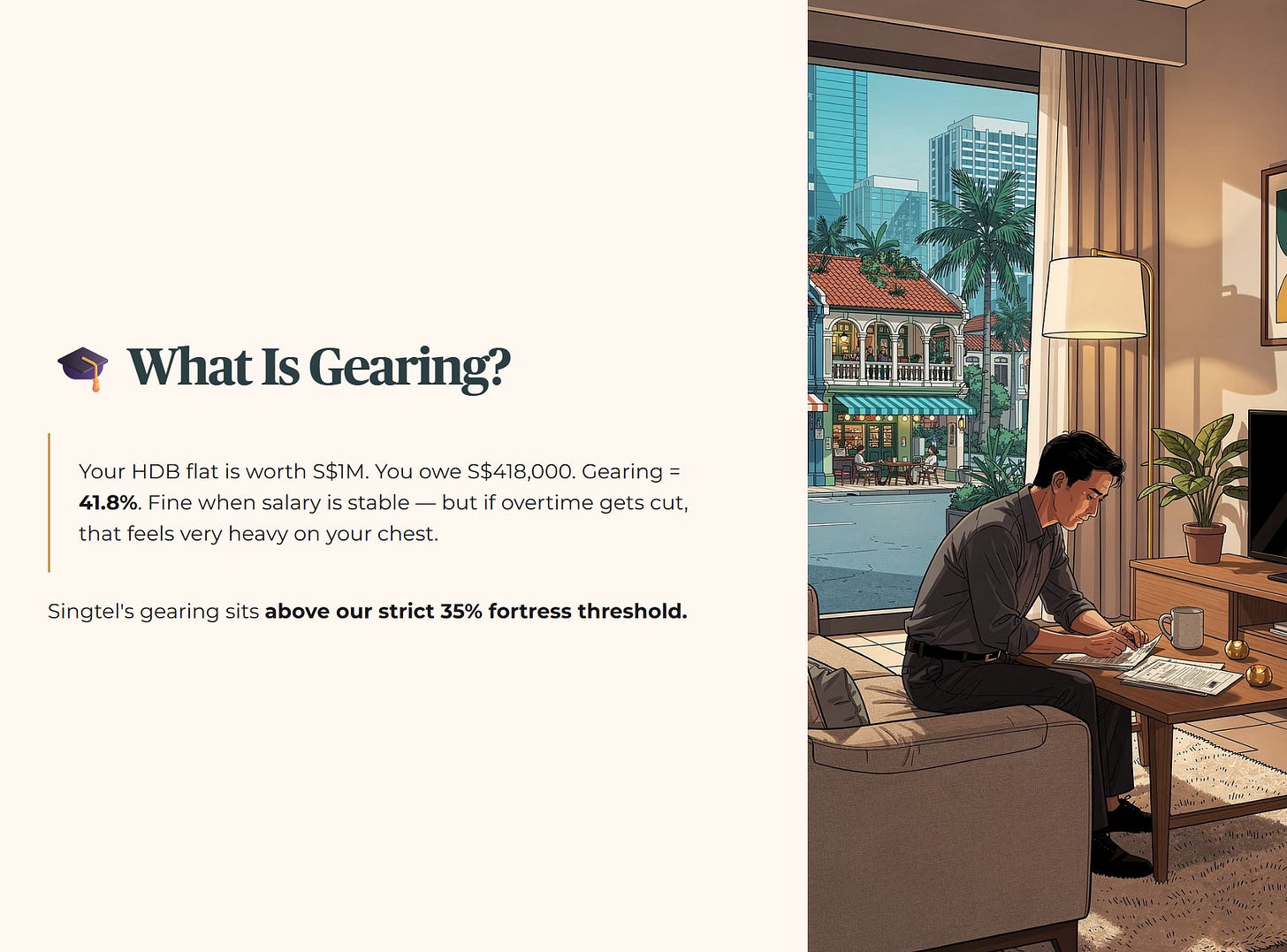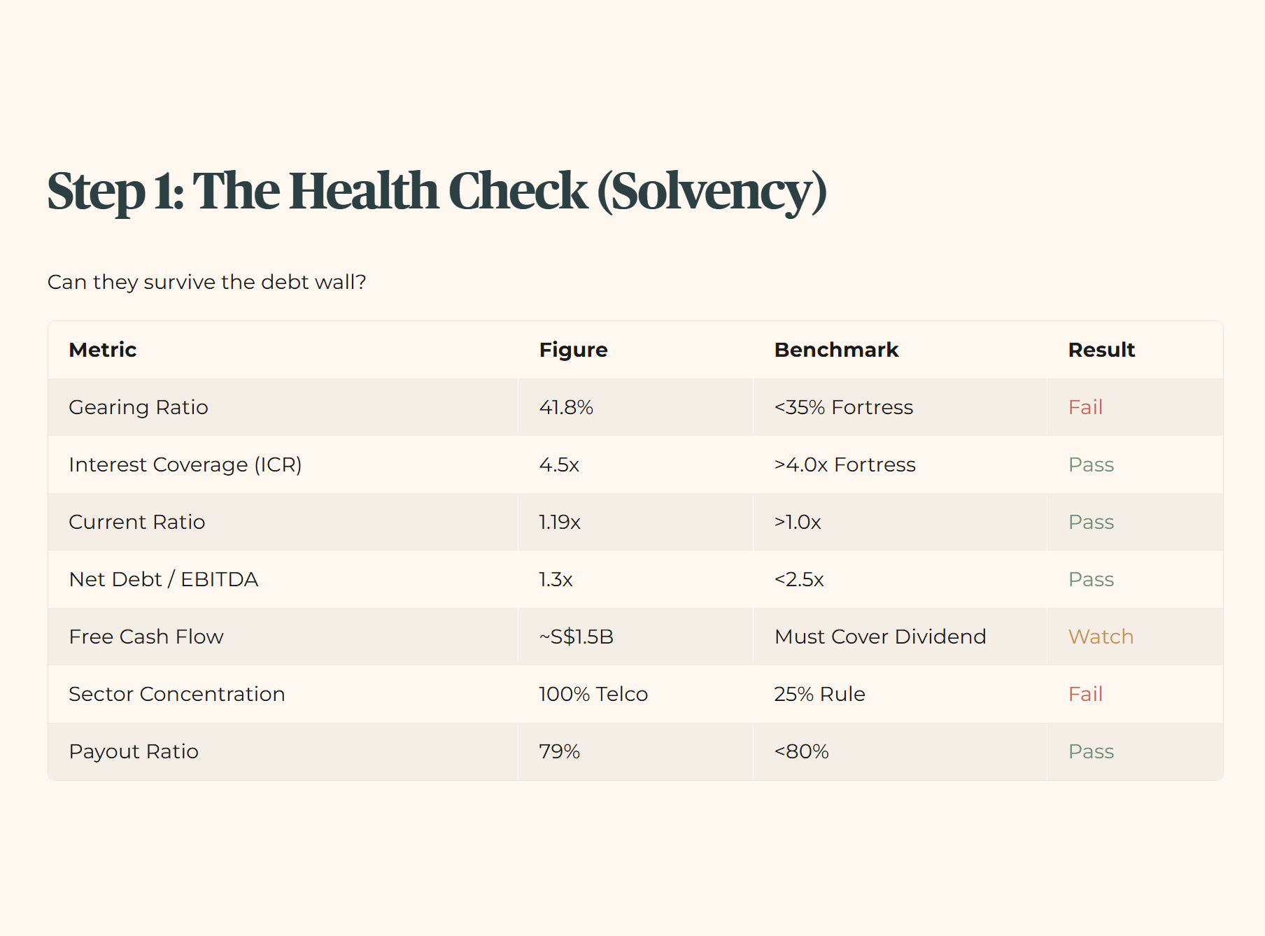 🎓 Educational Note: Gearing In kopitiam logic, gearing is simply your HDB housing loan. If your flat is worth S$1 million and you owe HDB S$418,000, your gearing is 41.8%. It feels perfectly fine when your monthly salary is stable. But if your overtime pay gets cut, that 41.8% suddenly feels very heavy on your chest. Singtel’s gearing sits above our strict 35% fortress threshold.