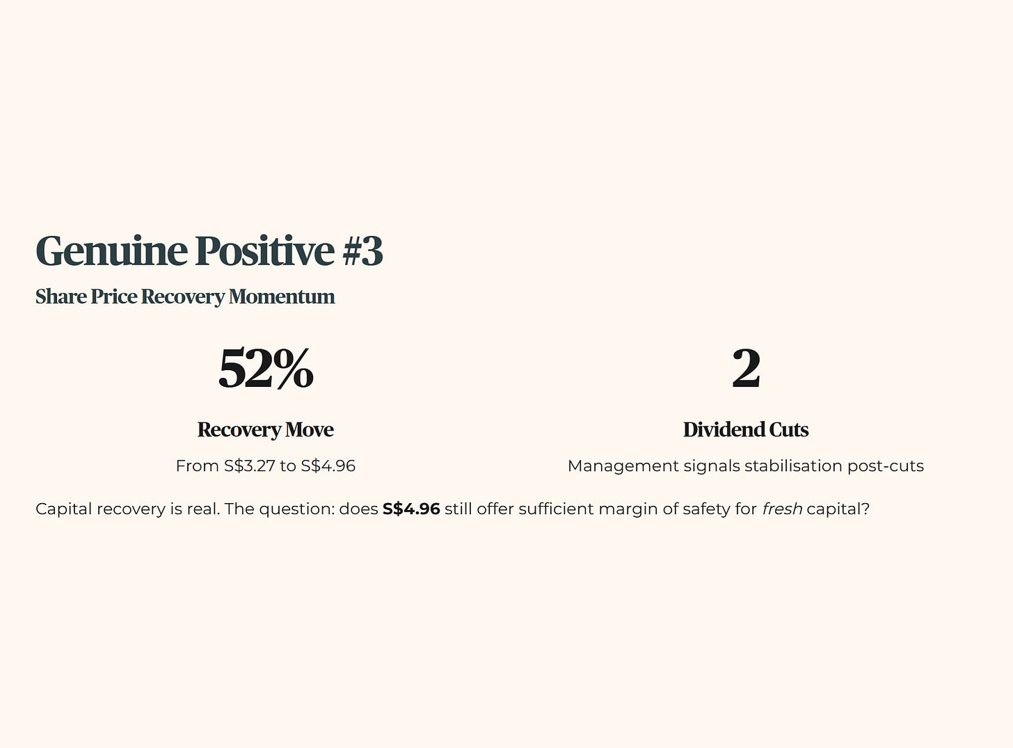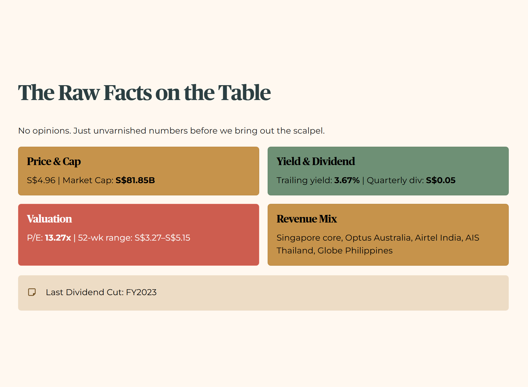 From its 52-week low of S$3.27, Singtel has staged a significant recovery to S$4.96 — a 52% move that reflects genuine market confidence in the turnaround narrative. Management has signalled dividend stabilisation after two painful cuts. For an investor already holding from lower prices, the capital recovery is real. The question is whether the current price still offers sufficient margin of safety for fresh capital deployment.